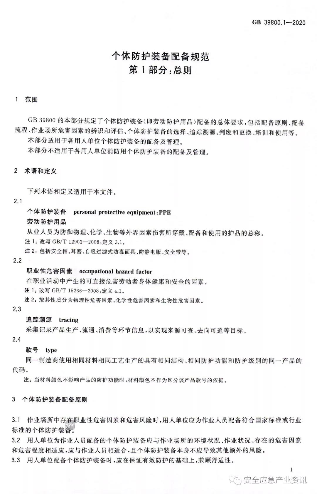 GB39800.1-2020《個(gè)體防護(hù)裝備配備規(guī)范第1部分:總則》適用于各用人單位個(gè)體防護(hù)裝備的配備及管理,不適用于各用人單位消防用個(gè)體防護(hù)裝備的配備及管理。