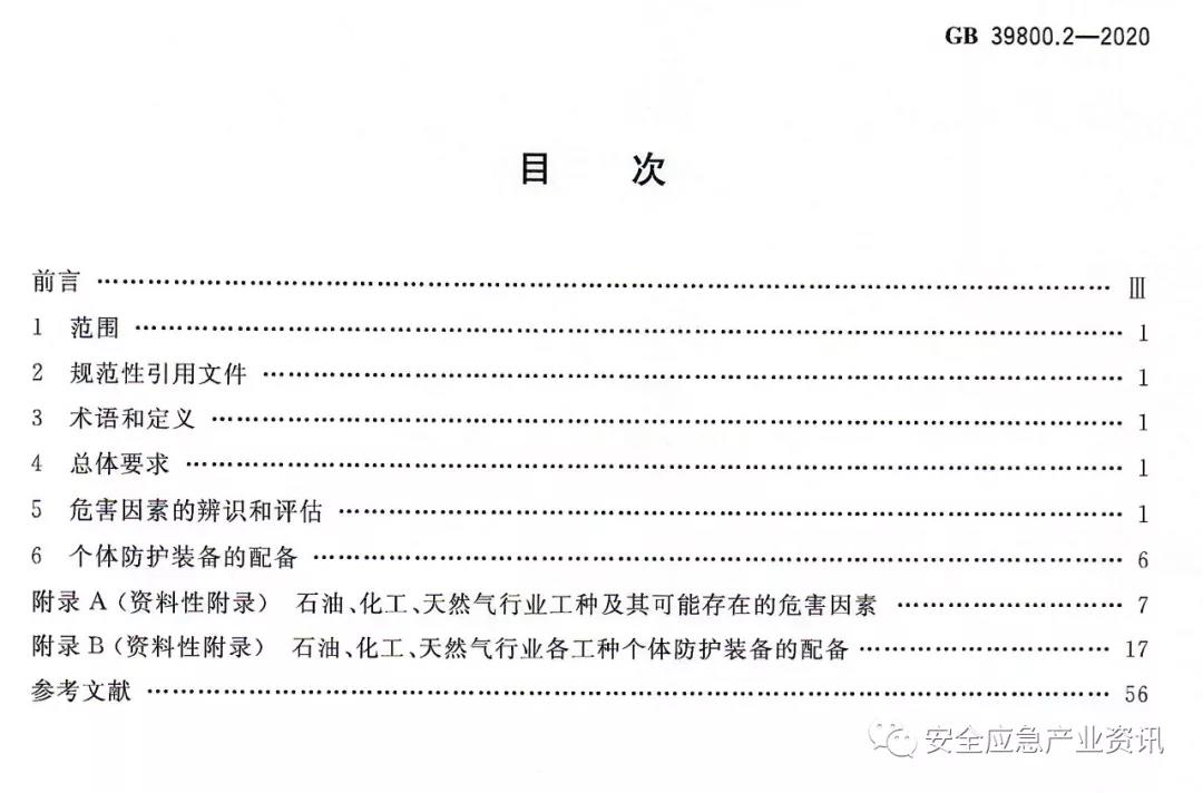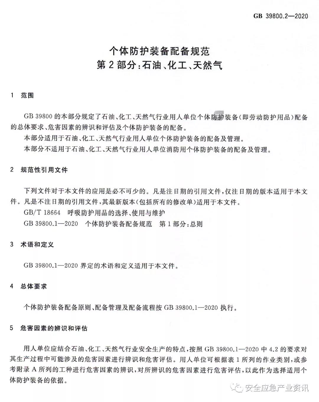 GB39800.2-2020《個(gè)體防護(hù)裝備配備規(guī)范第2部分:石油、化工、天然氣》規(guī)定了石油、化工、天然氣行業(yè)用人單位個(gè)體防護(hù)裝備(即勞動(dòng)防護(hù)用品)配備的總體要求、危害因素的辨識(shí)和評(píng)估及個(gè)體防護(hù)裝備的配備。