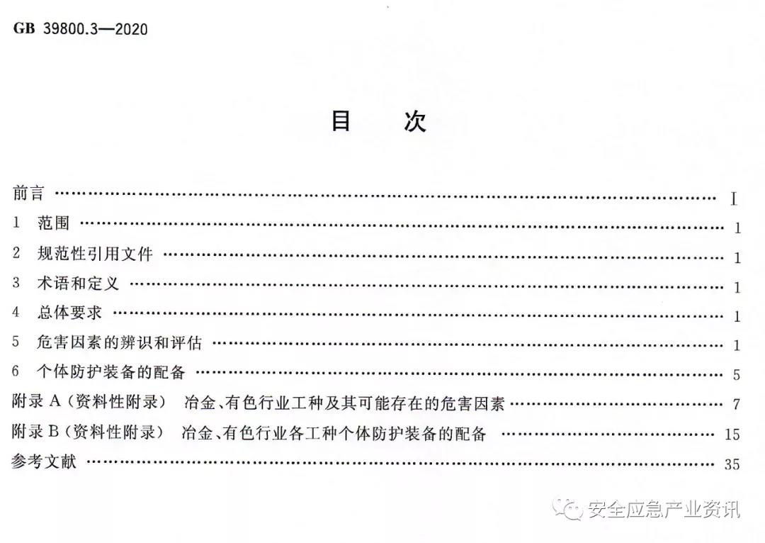 GB39800.3-2020《個(gè)體防護(hù)裝備配備規(guī)范第3部分:冶金、有色》規(guī)定了冶金、有色行業(yè)各用人單位個(gè)體防護(hù)裝備(即勞動(dòng)防護(hù)用品)配備的總體要求、危害因素的辨識(shí)和評(píng)估及個(gè)體防護(hù)裝備的配備。